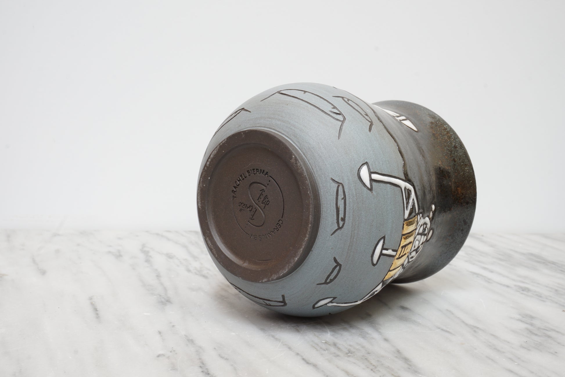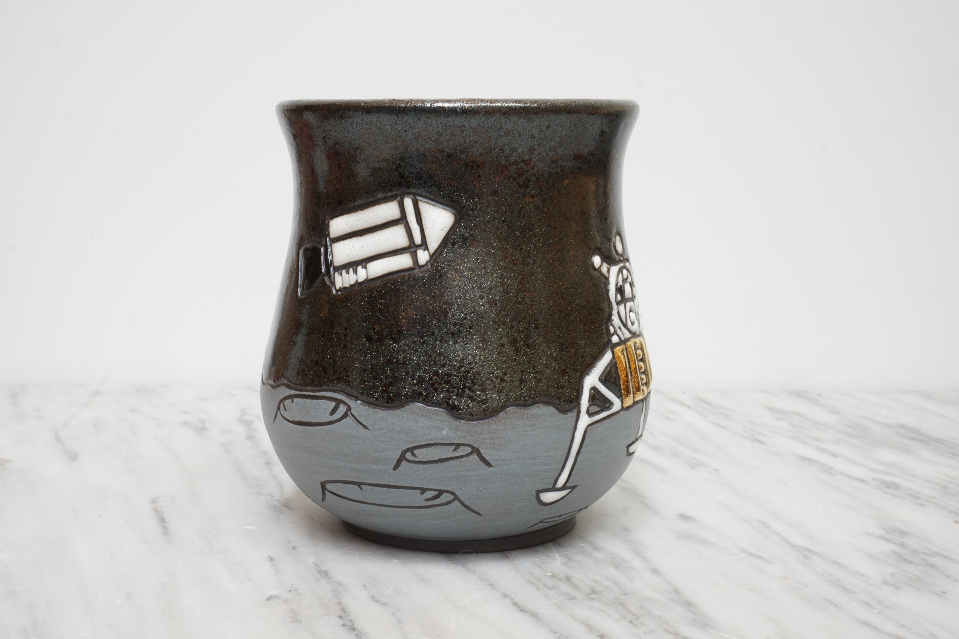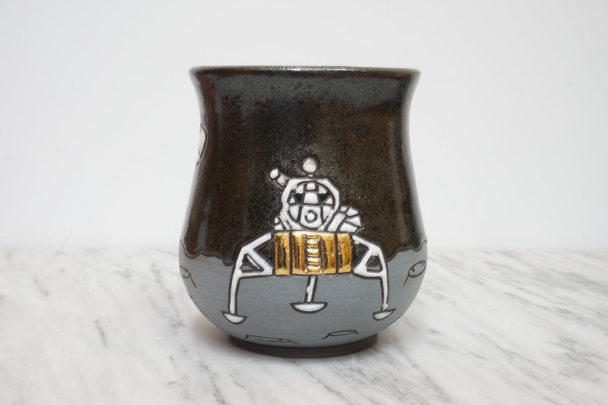 One of a kind tumbler with a sgraffito glazed carving of the Apollo Lunar Module and the Apollo Command Module. The Lunar Module features 22k Gold on the body of the module. The tumbler features a glittery black glaze on the interior and exterior.