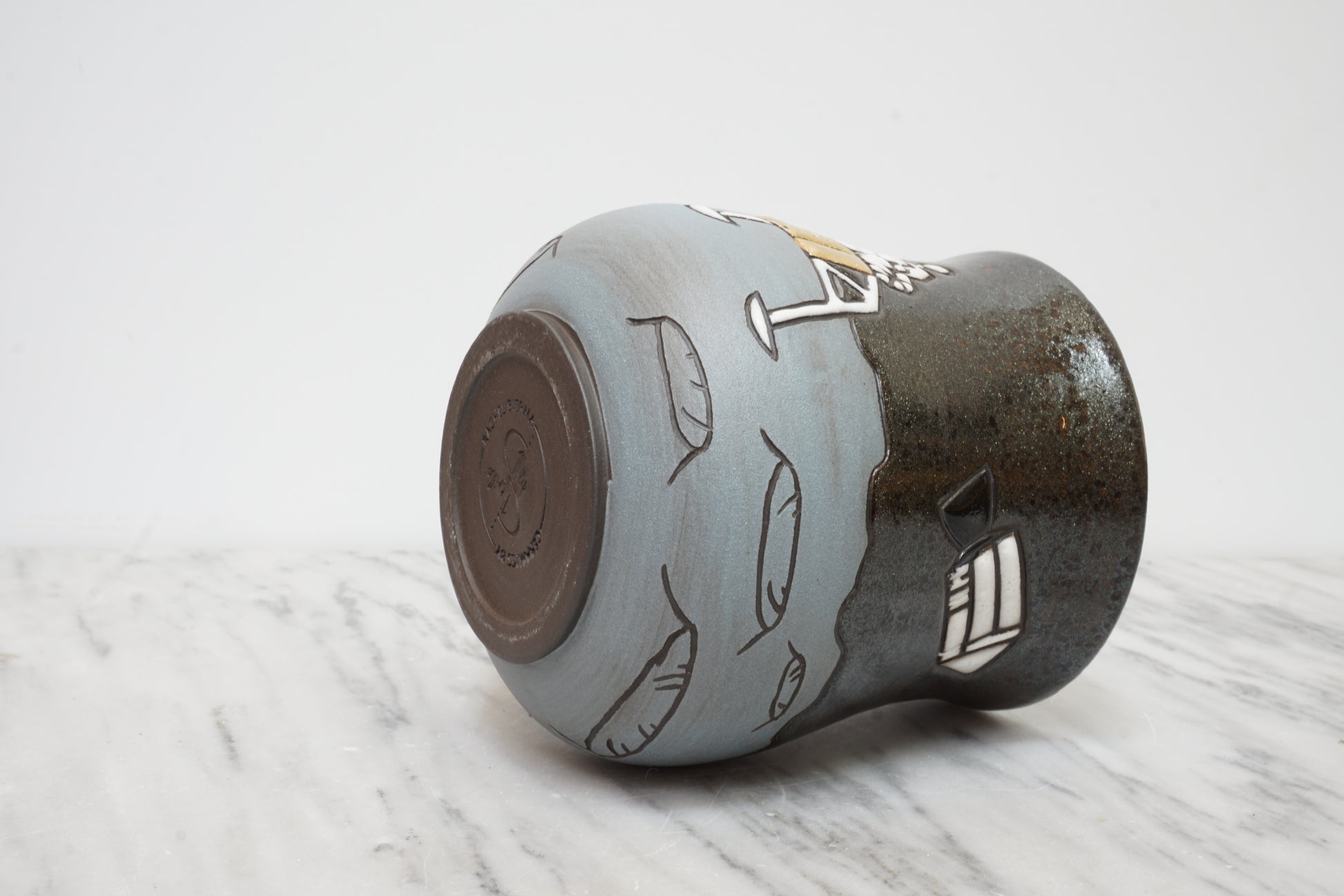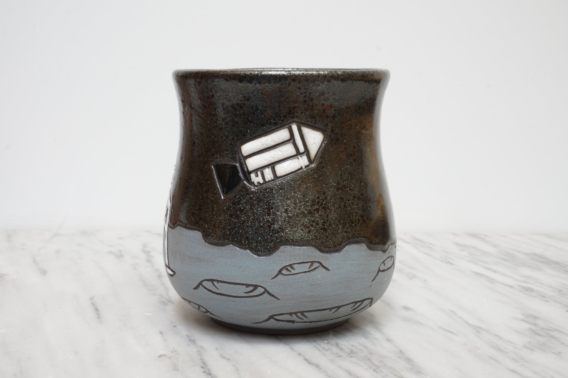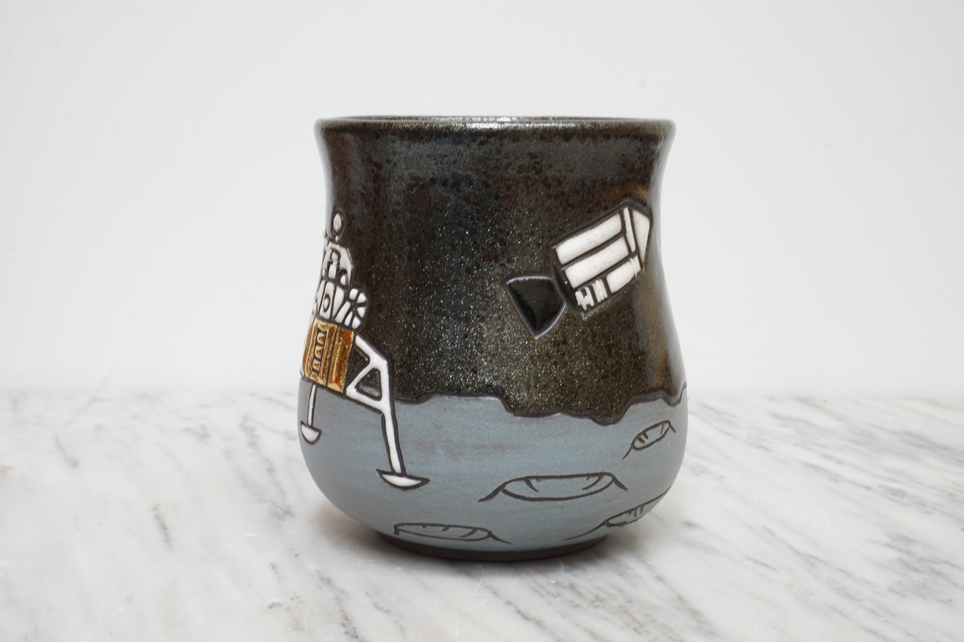 One of a kind tumbler with a sgraffito glazed carving of the Apollo Lunar Module and the Apollo Command Module. The Lunar Module features 22k Gold on the body of the module. The tumbler features a glittery black glaze on the interior and exterior.