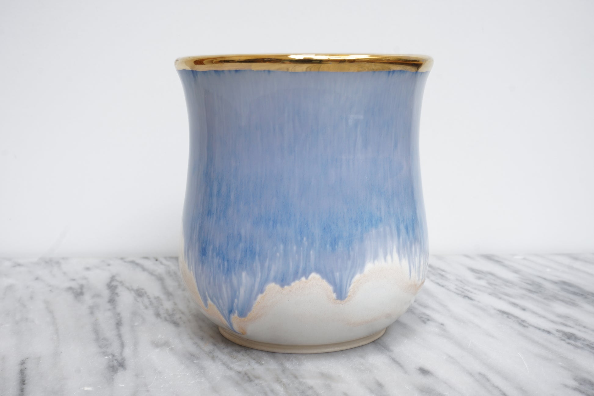 One of a kind tumbler with a blue and cream gradient glaze and a 22k gold rim.