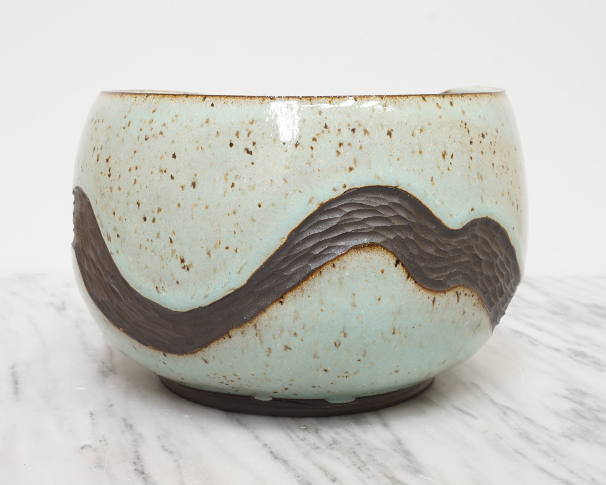 This yarn bowl is an excellent addition to any craft room! Made of black stoneware with a robin's egg glossy glaze, this yarn bowl features holes and a spiral for threading yarn. The outside features carvings in my signature Styolite Pattern with a graceful wavy line of raw clay meandering across the piece.