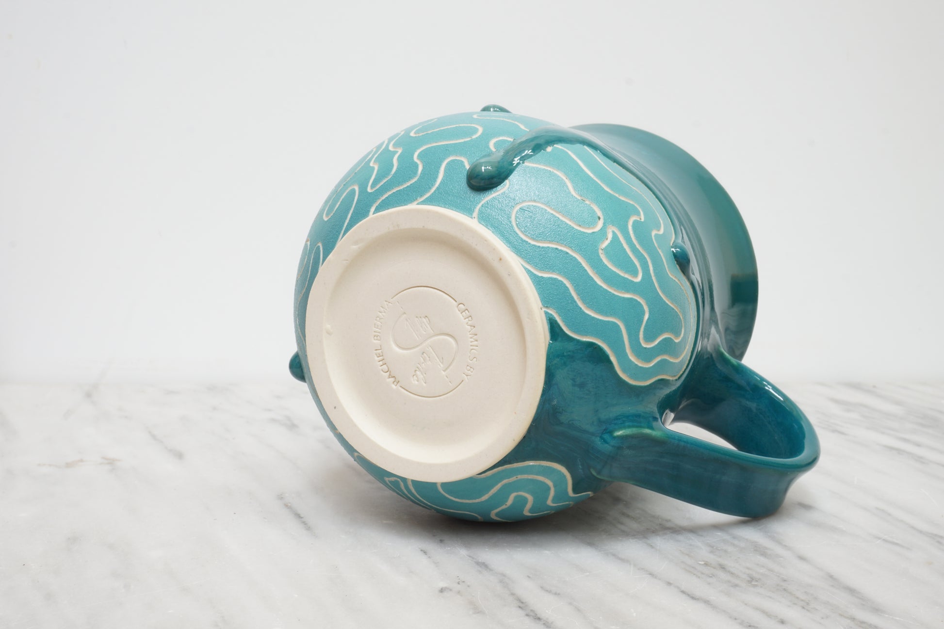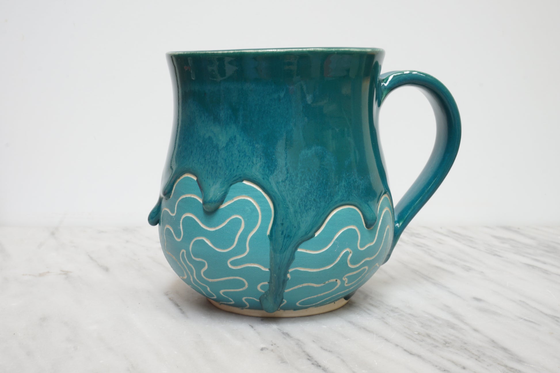 The mug is glazed in a teal blue reminiscent of the mineral Dioptase.