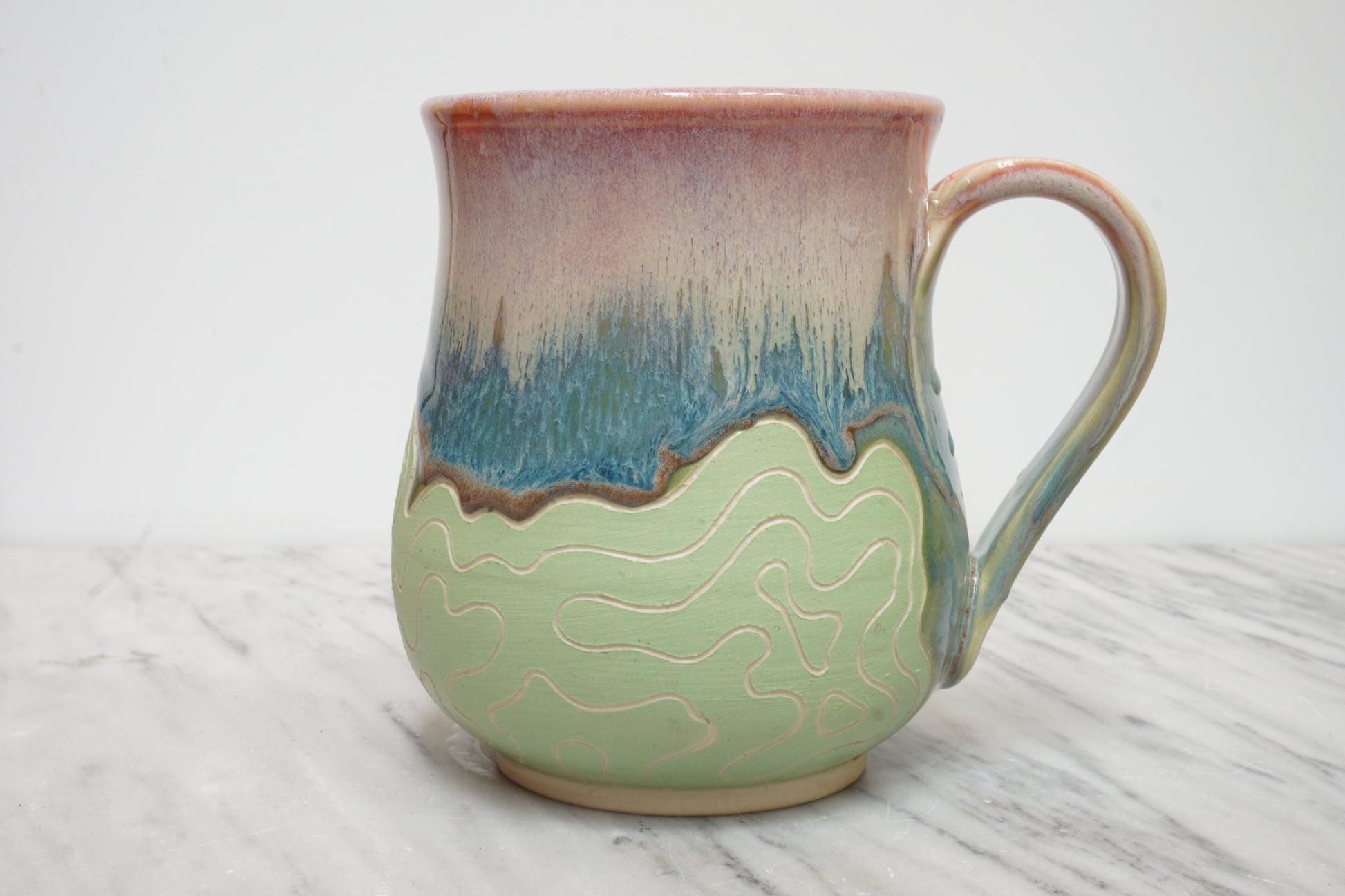 One of a kind mug with a sgraffito carving of a Topographic Map motif. While the map is not of a real place, all the same principles of map making apply.
