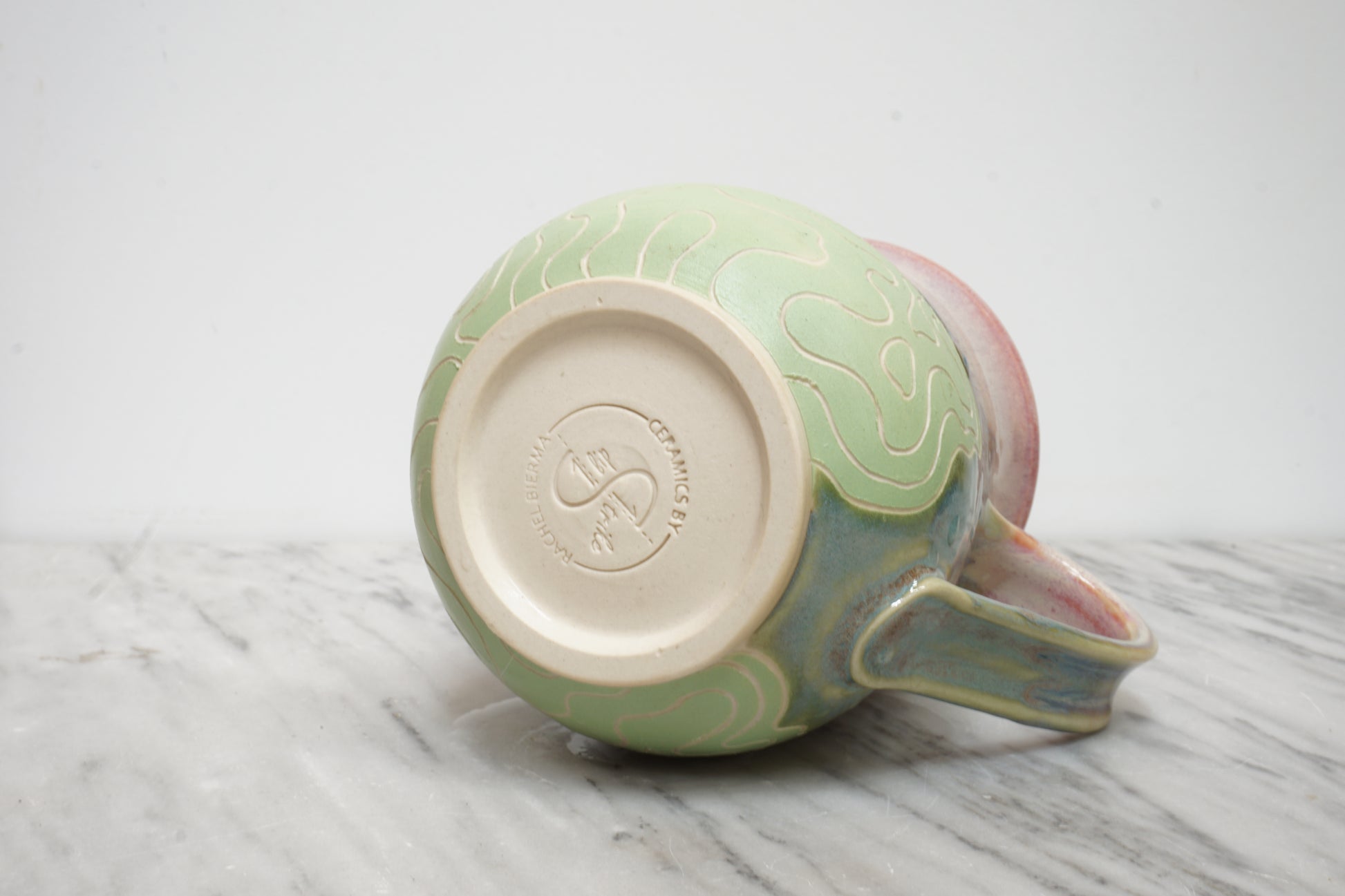 The mug is glazed in a pink glaze that breaks to mint green reminiscent of the banding seen in Watermelon Tourmaline.