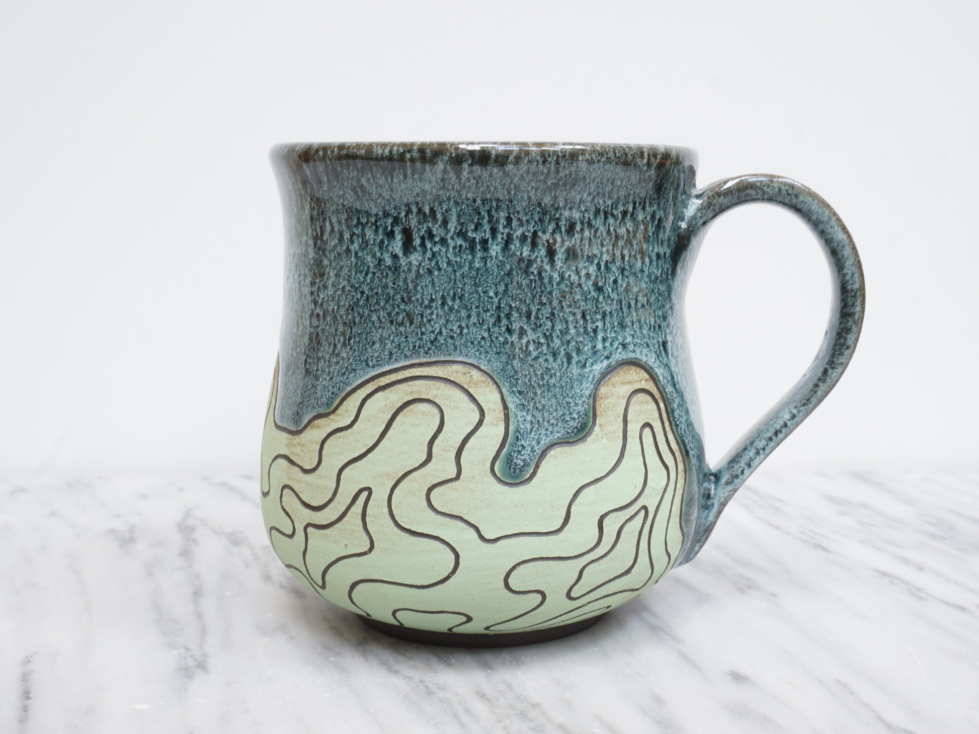 One of a kind mug with a sgraffito carving of a Topographic Map motif. While the map is not of a real place, all the same principles of map making apply.