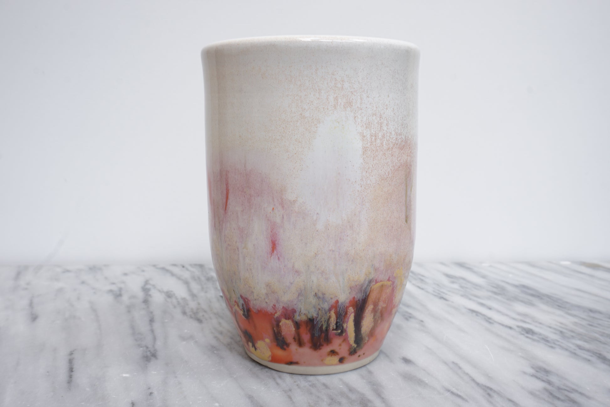 One of a kind travel tumbler glazed with a pink spotted glaze. Tumbler includes a leakproof BPA free silicone lid.
